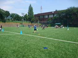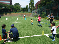 最後のメニューはサーキット。ラインを一本橋に見立ててその上を歩き、コーンをジグザグに通り抜け、半球状のクッションでジャンプし、ミニハードルを走り抜けて行きました。