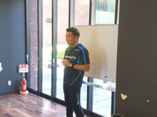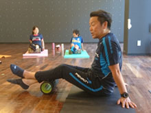 筋膜リリースは「グリッド」(筒状の用具)を使って行いました。まずは片側だけ行い、筋膜リリースを行った側と行っていない側で動作の違いを感じてもらうことで、効果を体感してもらいました。