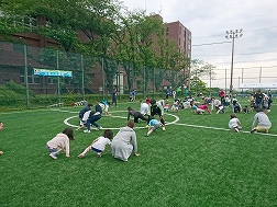 変身ウォーキング、変身フライイング。コーチの合図で様々なものになって歩きます。熊だったり、蛇だったり、蝶々だったり、ジェット機だったり。それぞれの思う姿に変身しました。。