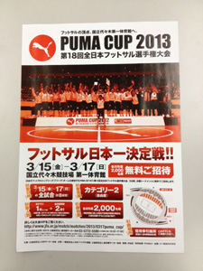 3月15日(金)~3月17日(日)に国立代々木競技場第一体育館で行われる「第18回全日本フットサル選手権PUMA CUP2013」決勝トーナメントの招待券引換チラシを、2月17日(日)小田原アリーナで行われる「湘南ベルマーレフットボールフェスタ2013」で配布いたします。