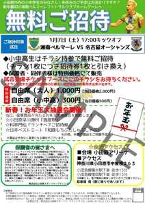 1月7日(土)ゼビオFリーグ2016/2017第27節名古屋オーシャンズ戦は小田原市内の小中学生の皆さんを無料ご招待を実施いたします。