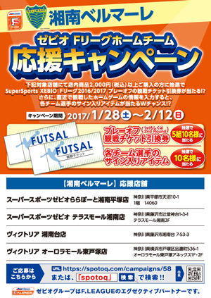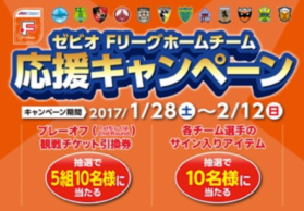 ゼビオFリーグ12クラブのホームタウン近隣にあるSuperSports XEBIOおよびVictoria店舗において、店内商品2,000円(税込)以上ご購入いただいた方を対象に、プレーオフの観戦チケット引換券や選手のサイン入りアイテムが当たる、ホームチーム応援キャンペーンを実施中です。