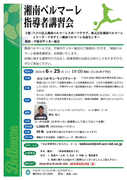 湘南ベルマーレでは、2016年6月25日(土)に馬入ふれあい公園ひらつかサン・ライフアリーナにて平塚市サッカー協会のご後援をいただき、「湘南ベルマーレ指導者講習会」を開催いたします。