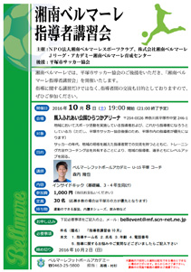 湘南ベルマーレでは、2016年10月8日(土)に馬入ふれあい公園ひらつかサン・ライフアリーナにて平塚市サッカー協会のご後援をいただき、「湘南ベルマーレ指導者講習会」を開催いたします。