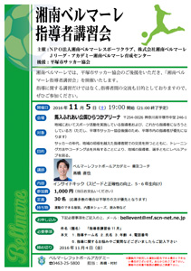 湘南ベルマーレでは、2016年11月5日(土)に馬入ふれあい公園ひらつかサン・ライフアリーナにて平塚市サッカー協会のご後援をいただき、「湘南ベルマーレ指導者講習会」を開催いたします。