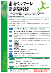 湘南ベルマーレでは、2017年1月14日(土)に馬入ふれあい公園ひらつかサン・ライフアリーナにて平塚市サッカー協会のご後援をいただき、「湘南ベルマーレ指導者講習会」を開催いたします。