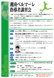 湘南ベルマーレでは、2017年2月11日(土)に馬入ふれあい公園ひらつかサン・ライフアリーナにて平塚市サッカー協会のご後援をいただき、「湘南ベルマーレ指導者講習会」を開催いたします。