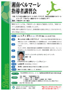 湘南ベルマーレでは、2017年7月15日(土)に馬入ふれあい公園ひらつかサン・ライフアリーナにて平塚市サッカー協会のご後援をいただき、「湘南ベルマーレ指導者講習会」を開催いたします。