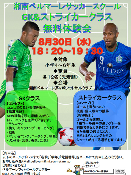 8月30日(水)に小学4〜6年生を対象とした湘南ベルマーレサッカースクール「GK&ストライカークラス無料体験会」を湘南ベルマーレ茅ヶ崎フットサルクラブにて開催いたします。
