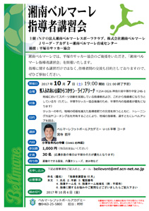 湘南ベルマーレでは、2017年10月7日(土)に馬入ふれあい公園ひらつかサン・ライフアリーナにて平塚市サッカー協会のご後援をいただき、「湘南ベルマーレ指導者講習会」を開催いたします。