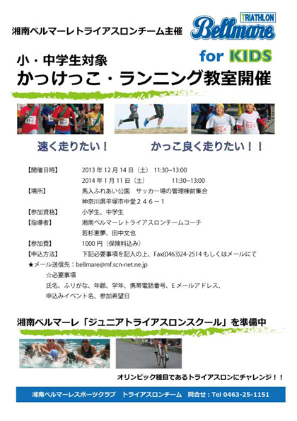 湘南ベルマーレトライアスロンチームの選手が行うランニング教室です。身体の様々な機能を目覚めさせ、楽しみながら走るスピードをUpさせてゆきます。
