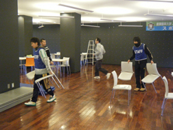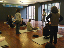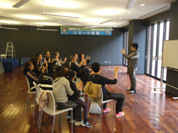 今回も産業能率大学の学生たちが教室の開催をサポートしてくれました。会場は室内でしたが、当日の天気はあいにくの雨。そんな中でも駐車場の案内看板設置、参加者の会場への誘導もいつも通りきちんと対応ができていました。教室の最中も、椅子の片付けやストレッチマットの準備とスムーズに教室が進行するよう流れに合わせて対応してくれました。