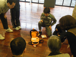 そしてもう一つコーチが普段の講習に持参しているAED(自動体外式除細動器)の説明も。ケースを開いて実際にどのようなものか、もしもの時に慌てないよう参加者にも見てもらいました。