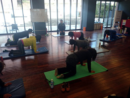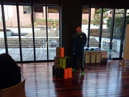 実践では「グリッド」(写真内で参加者が使用している筒状の用具)を使って、筋膜をほぐして、ゆがみを整えていきました。左右順番に行いがら実施前後の違い、効果を確認しながら進んで行きました。