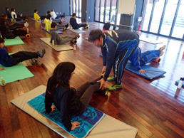続けては、動きを付けながらのストレッチング。間違った動作だと逆に身体のゆがみが増してしまうので、正しい動作になるよう竹江トレーナーも丁寧に解説をしながら、一人一人にも声を掛けながら進行しました。