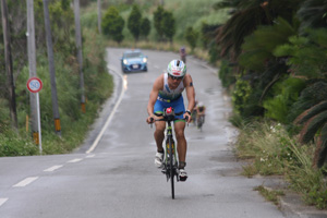 悪天候のためスイムがランに変更となり、ラン6.5km、バイク157km、ラン42kmという競技形式で行われました。戸原は第1ランを楽なペースで入り、バイク序盤で 海外招待選手で構成される2位集団入り、前を積極的に追いました。後半、他の選手がペースダウンする中、昨年優勝のベンジャミン・ウイリアムス選手(オーストラリア)に食らいつき、バイクを3位で終えました。