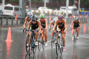 スタート直後から激しい雨が降る中でのレースとなりました。福岡は、先頭から30秒遅れてバイクに移り、積極的に上田藍選手について行き、前の集団を追いましたが、そこにはついて行けず、第2集団を待って前を追いました。雨が強く降る中、落車の危険性が高まり、コーナーの多いコースで思ったようにスピードを上げられない状況でしたが、バイク終盤で先頭集団に追いつきランに移りました。